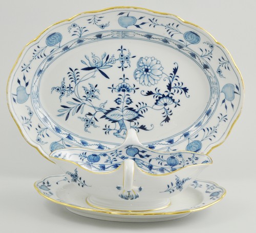 Onion pattern and a similar two handled sauce boat, and two tubs salts, (8).
