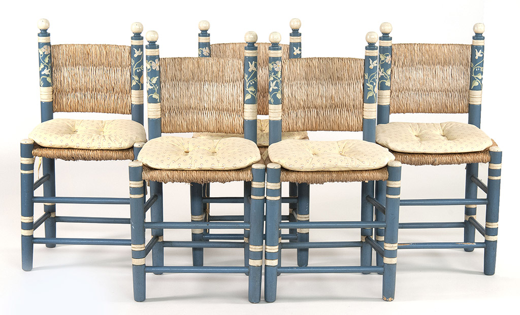 In blue with cream banding. Rush seats and backs. Heights of seats 19.25. Heights overall 37.25"."