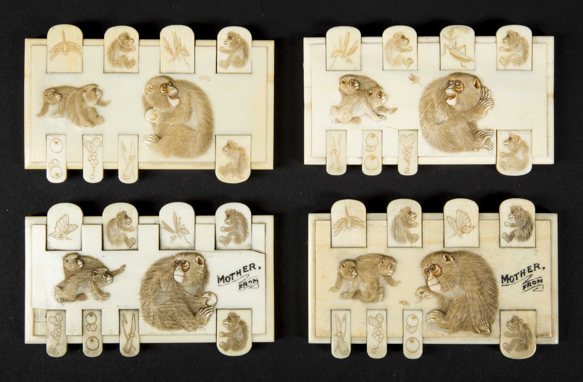each are rectangular in shape with side counters that lift up and having a raised monkey decoration, engraved with the name "Maude Ledyard, Japan 1900, Mother From" on the top and back of two