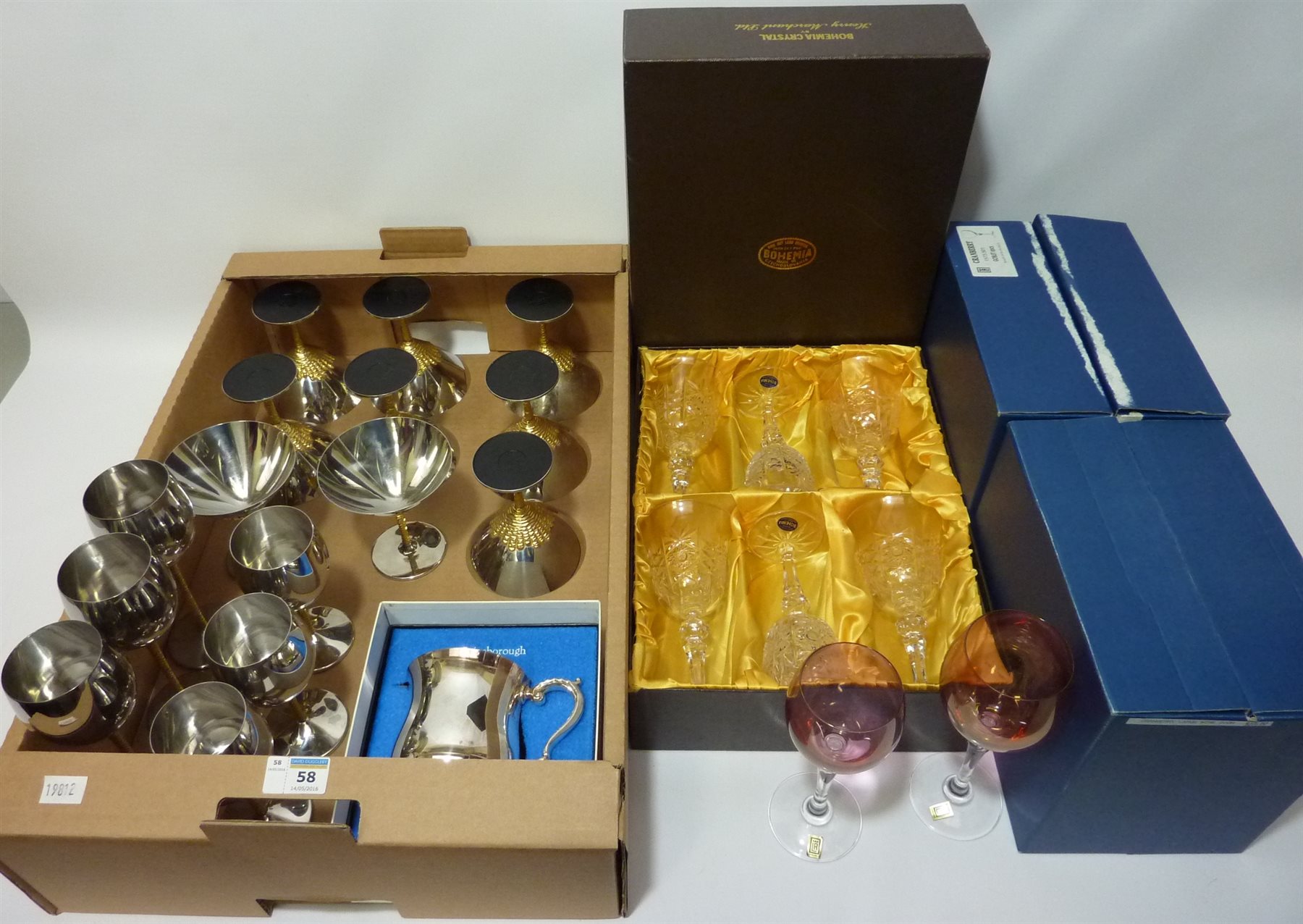 Set of six Bohemian crystal wine glasses (boxed) two sets of six drinking glasses with cranberry glass bowls, and Stewart Devlin