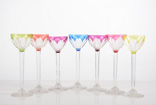 Set of six Stuart Crystal hock glasses, with tinted stems, height 18cm and ten tinted glass liquors.