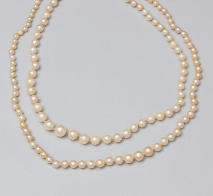 Set of two beautiful necklaces of pearls falling, gold clasps 750MM, circa 1900, weight: 23,18gr. gross