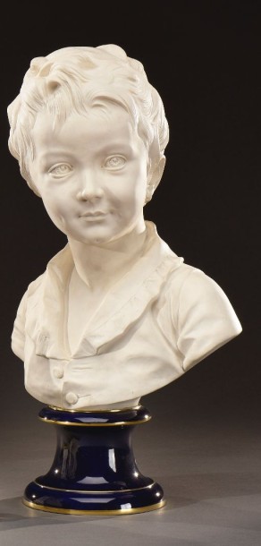 Buste en biscuit représentant Alexandre Brongniart (1770-1847), fils du célèbre architecte Théodore Brongniart (1739-1813), d'après le sculpteur Jean-Antoine Houdon (1741-1828). Piédouche en porcelaine bleue à filets or.