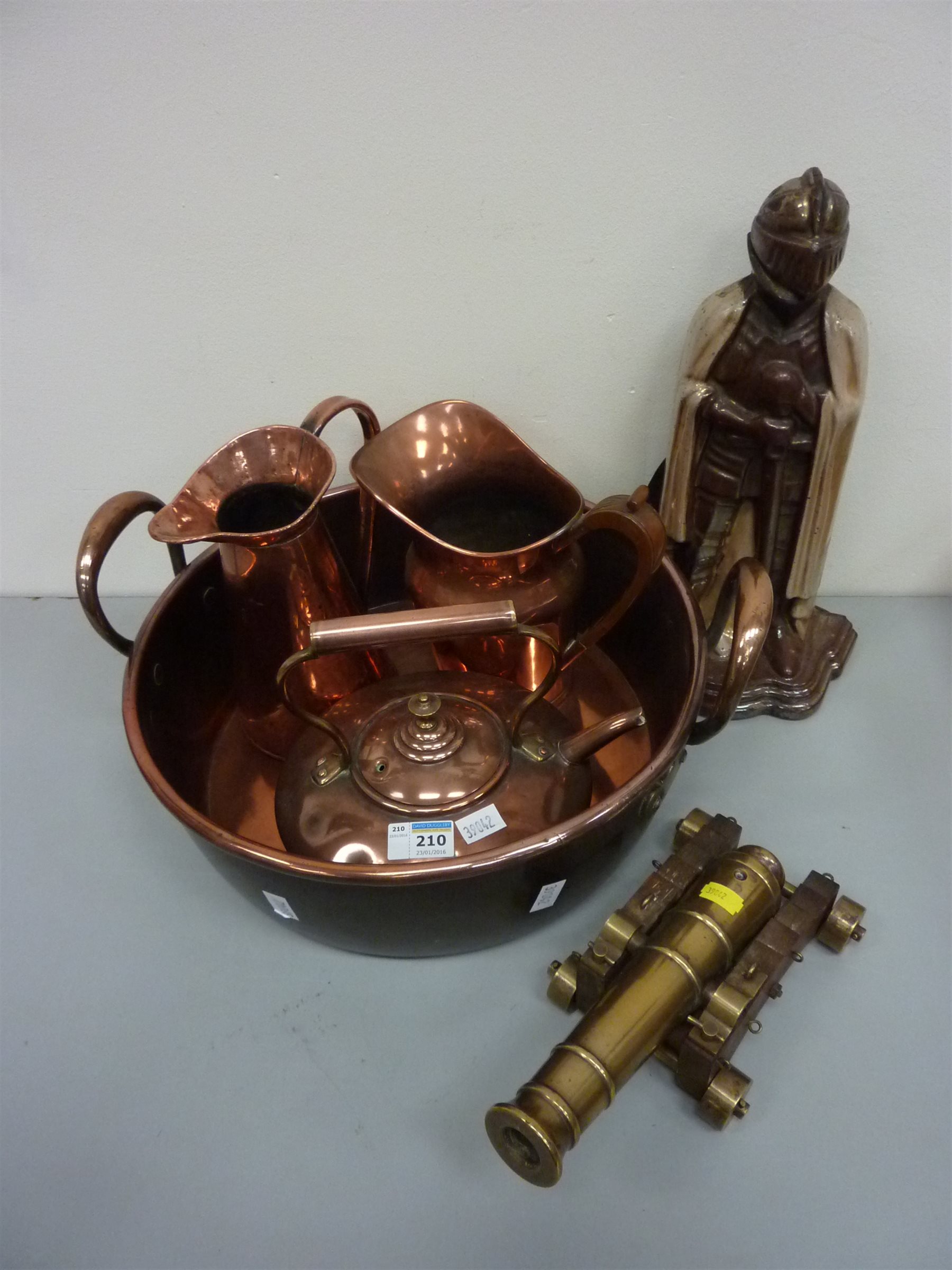 Shallow twin handled copper pot, copper kettle, two copper jugs, brass model canon and a companion stand in the form of a knight