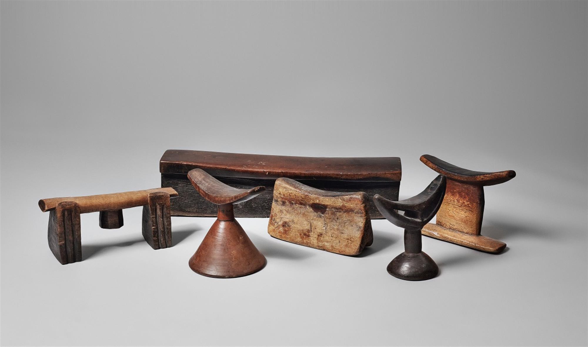 A large Zulu headrest on rectangular support; another on four grooved supports; two Ethiopian headrests on rectangular supports; and two others on conical supports, one with pierced top, glossy patinas.