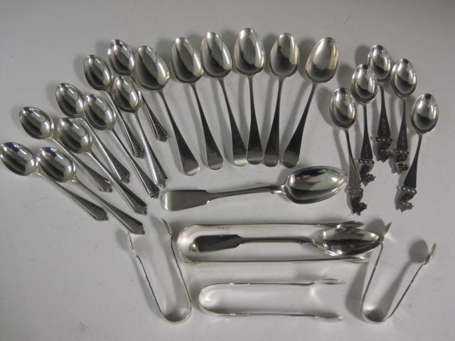 Six Victorian silver Teaspoons old english pattern engraved initials, London 1848, five silver Golfing Spoons with dragon head finials, nine E.G.C. Coffee Spoons, two fiddle pattern Teaspoons and four pairs of Sugar Tongs