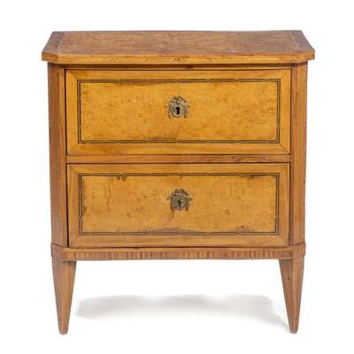 Small Bernese chest of drawers opening with two drawers, marquetry net decor and elm burl, tray with cut sides.