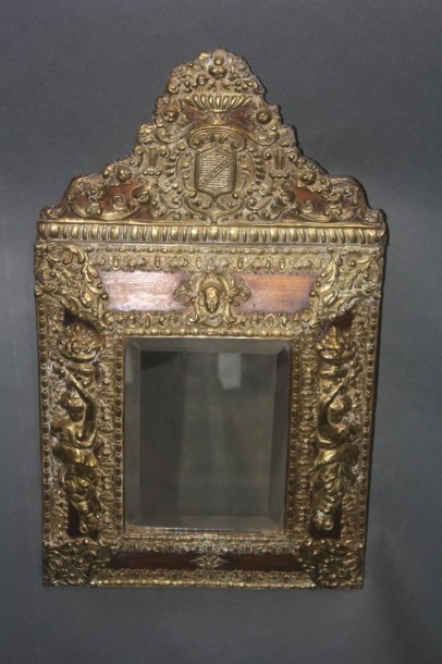 Small mirror with inverted profile and cutout front, trimmed with brass repoussé decorated with caryatids, masks, escutcheons and foliage.