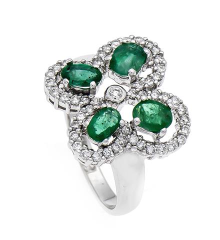Smaragd-Brillant-Ring WG 750/000 mit 4 feinen oval fac. Smaragden, zus. 1,36 ct in guter Farbe und Reinheit sowie 51 Brillanten, zus. 0,54 ct TW/VS-SI, RG 53, 6,7 g