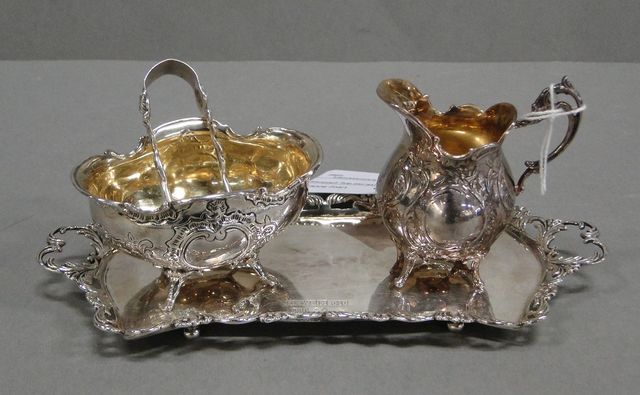 Sockerskål med tång, gräddsnipa och bricka, silver, H4,5 & 7cm L7 & 19,5cm, total vikt 315g