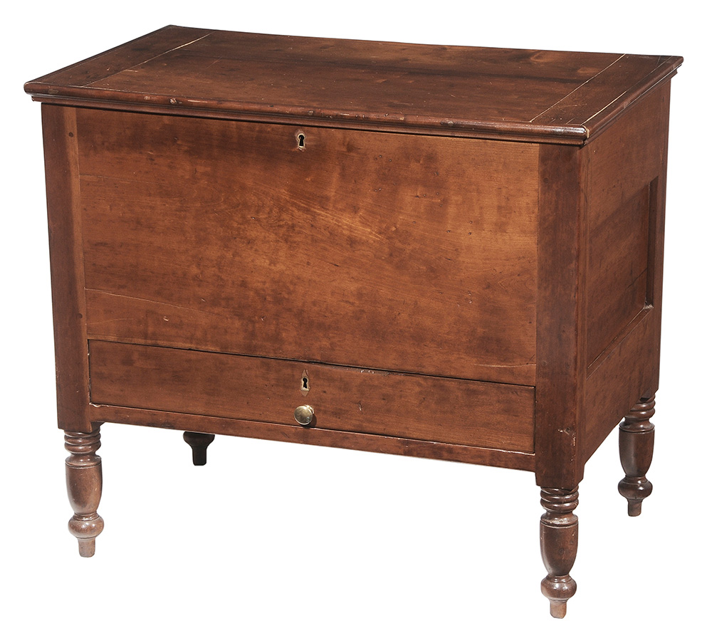 hinged lid with open interior set with single divider, divided drawer, turned legs, dovetailed construction, poplar secondary
