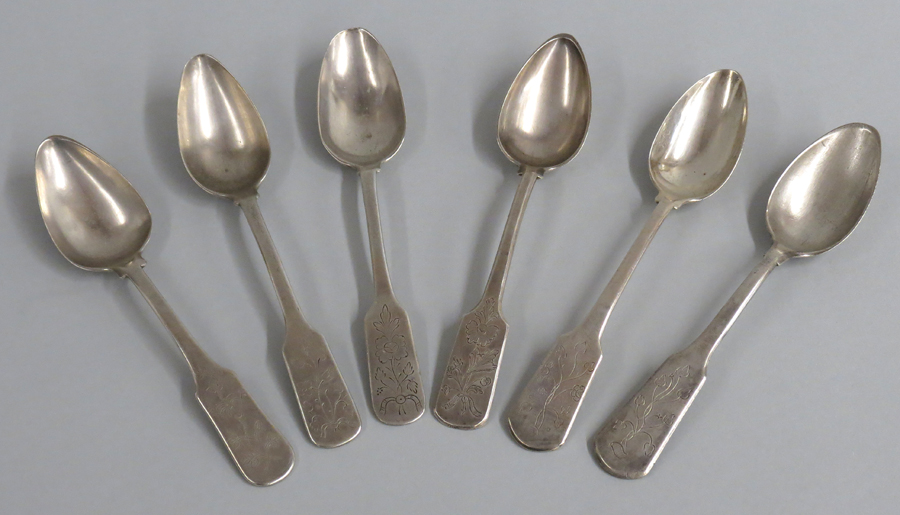 Guatemala, 1800-50 all with typical etched floral decoration, (3) with owner's initials on reverse, (1) with hallmark, approx. 7.25"; 10 troy oz. total (314 grams)