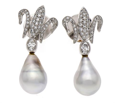 Südseeperl-Brillant-Ohrstecker WG 750/000 mit jeweils einer feinen tropfenförmigen Südseeperle 14 x 9 mm mit gutem Lüster, einem ovalen Diamanten, zus. 0,30 ct TW/VS und Brillanten, zus. 0,60 ct TW/VS, L. 29 mm, 8,7 g