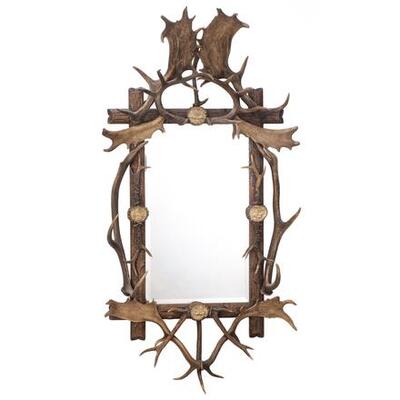 Swiss vertical mirror of the 'Black Forest' with antler and deer framing, 4 medallions depicting deer. Early twentieth