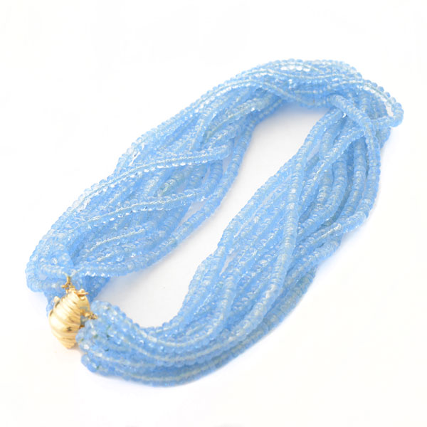 Composed of numerous faceted synthetic spinel beads, completed by a 14k yellow gold grooved clasp with figure eight safety, forming a twelve strand, 16 1/2 inch necklace.