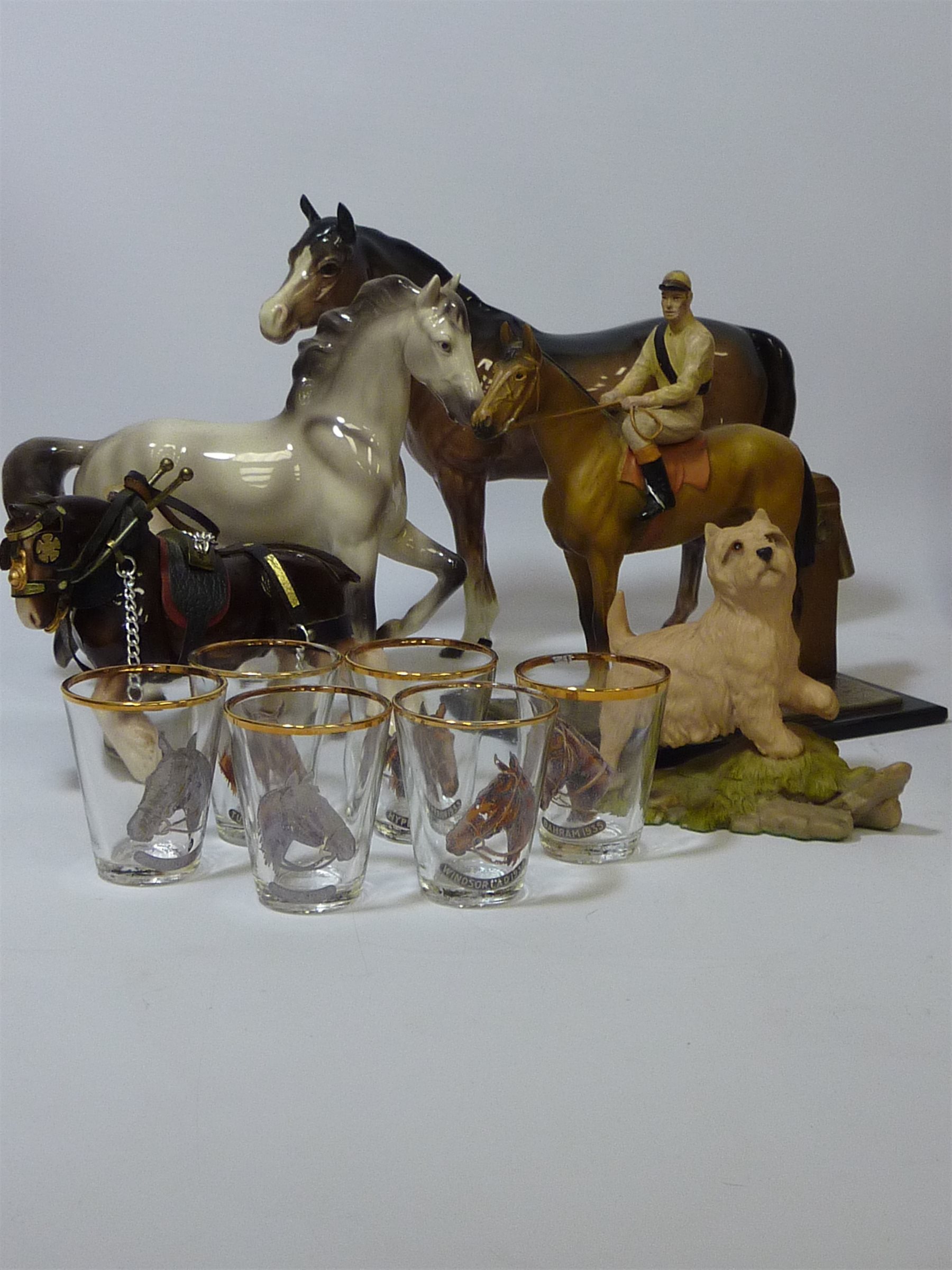 Table Lighter in the form of a horse and jockey H15.5cm (incomplete) Beswick bay horse, Royal Belvedere Vienna grey horse, Shire horse, set of six shot glasses decorated with heavy horses, and an Aynsley West Highland Terrier ornament