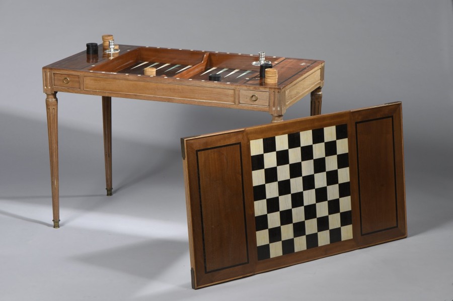 Mahogany mahogany plywood table and mahogany veneer. It rests on four tapered, fluted and rudented feet terminated by gilded brass hooves. The mobile plate inlaid in ivory and ebony on a chessboard on one side is dark leather on the other.