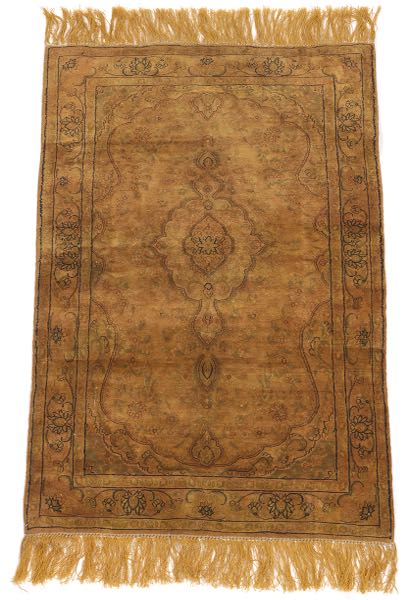 3'7" x 2' Low dense silk pile on silk weft. Field with central medallion with extensions, corner guards - floral-foliate design of sage-abmer-camel-black on gold background. Triple border with repeating serpentine floral-foliate motif on gold. Long