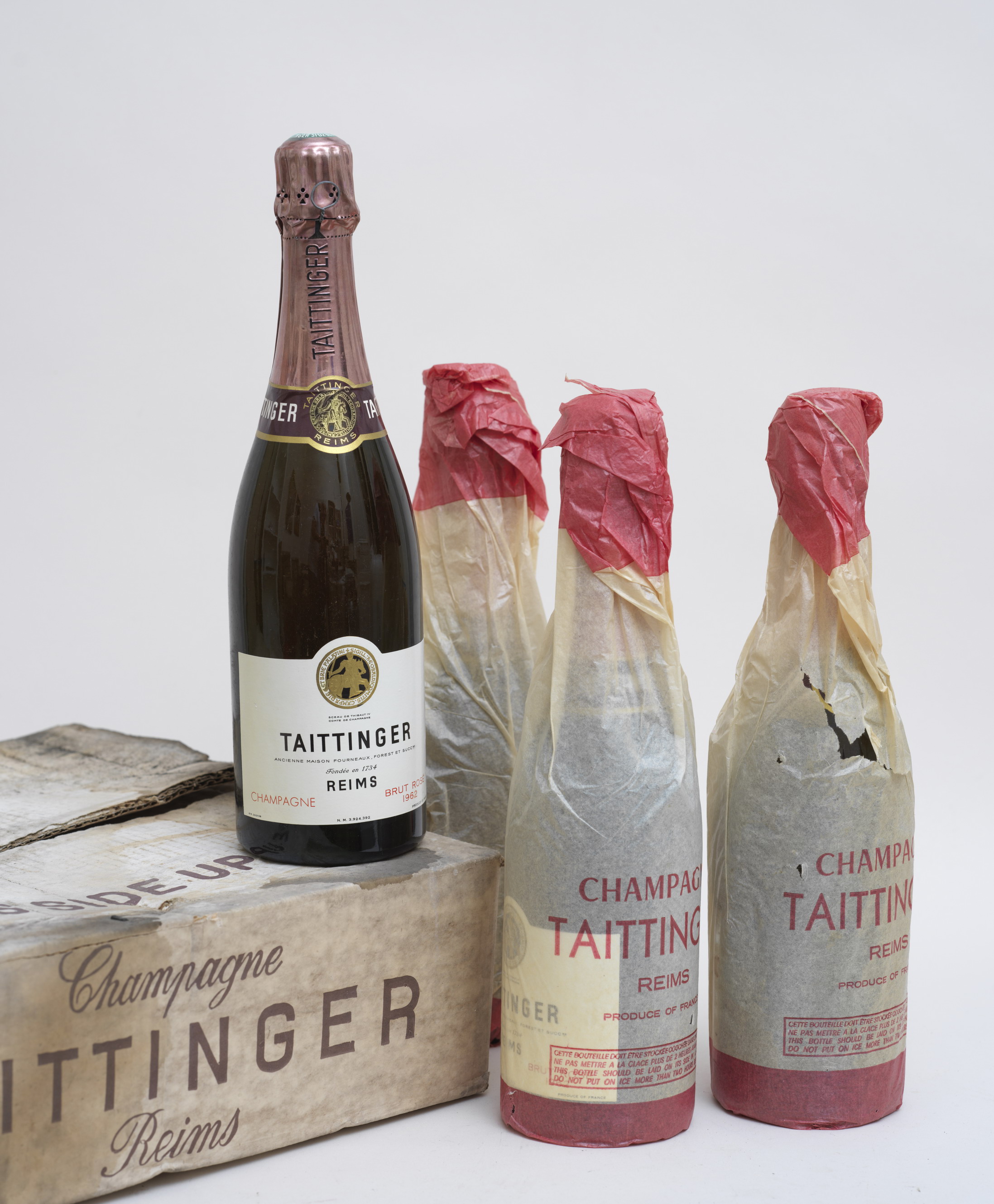 4 bottles CHAMPAGNE TAITTINGER 1962 Brut Rosé (levels under the collars, labels faded, marked, scratched, 1 damaged)