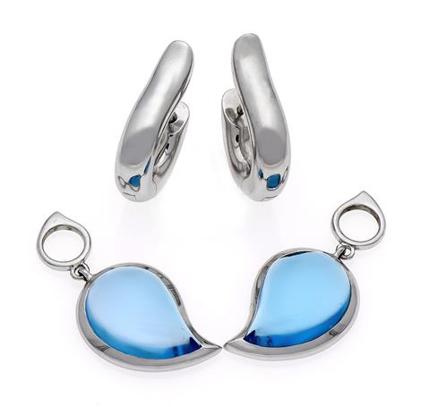 Tamara Comolli Drop Hoops Creolen WG 750/000 L. 23 mm, B. 5 mm, 12,8 g und passende Swiss-Blautopas-Einhänger WG 750/000 mit je einem feinen Swiss-Blautopascabochon, zus. 20,0 ct in excellenter Farbe und Reinheit, L. 33 mm, 10,5 g, mit Bucherer Rechn