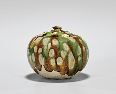 Chinese Tang Dynasty sancai glazed jarlet; well-potted of globular form, with incised rings and tapered handle to the subtly domed cover; applied with a web of bold amber, green and cream glaze; D: 4 1/2" (approx.)