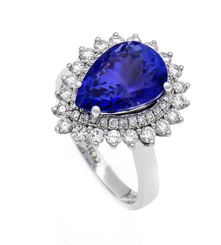Tansanit-Brillant-Ring WG 750/000 mit einem excellenten tropfenförmig fac., sehr feinen Tansanit 4,283 ct in excellenter Farbe und Reinheit sowie 46 Brillanten, zus. 0,68 ct TW/VS, RG 50, 3,0 g