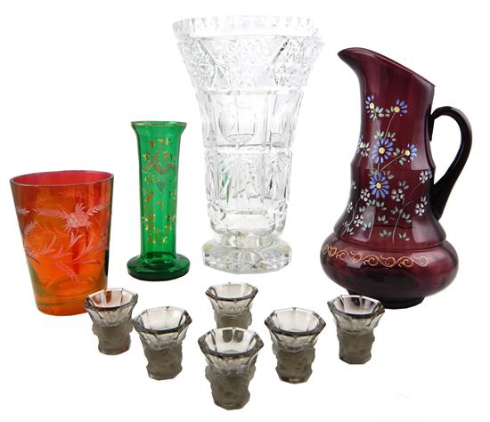 flared rim, each with four frosted female faces banding along base, unmarked, each approximately 2 1/4" h. x 2 1/4" diam.; amethyst water pitcher with floral and scroll enamel motif, applied handle, 13" h.; emerald cylindrical vase with enamel and gi