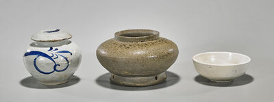 Three antique Korean ceramics: Silla Dynasty pottery vessel, of squat globular form, with incised bands to shoulders; together with Joseon Dynasty bowl and jar, each showing foliate motifs; L: 6 1/2" (longest, approx.)