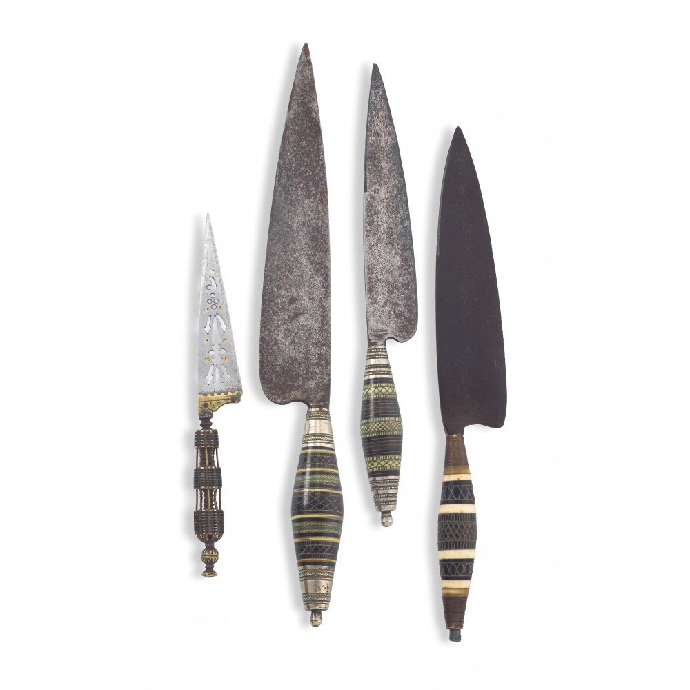 "each handle typically decorated with intricate patterns with various materials, two with silvered metal ends and the blades with punched in designs to one side and punched names and dated 1896 to the other, the largest example the blade signed, the