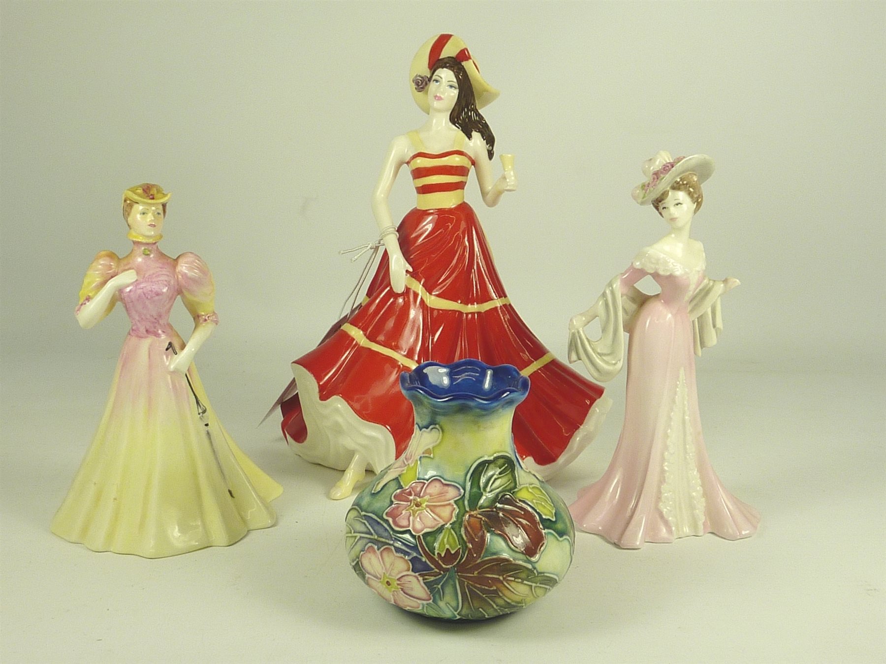 Three Coalport figures - 'My Sweetheart', 'Lady Evelyn' and one other, and a Old Tupton Ware tube lined vase decorated with flowers (4)