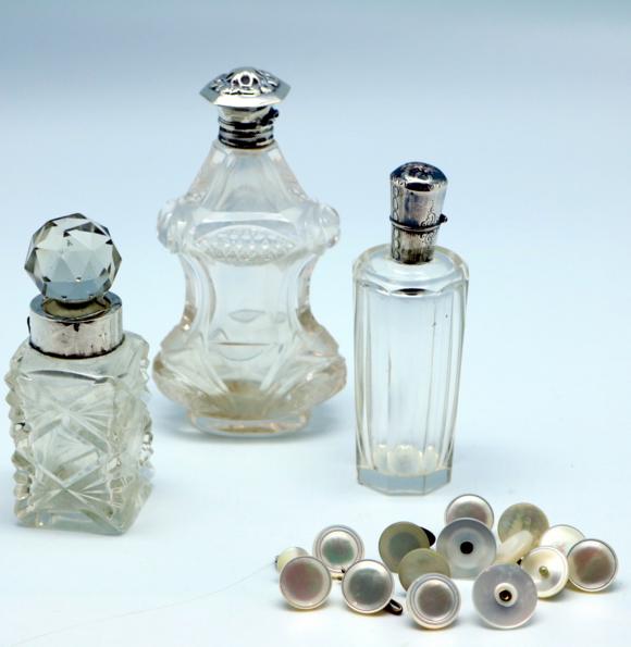Partly with defects and a bottle with crystal stopper and only silver cuff. Here some pearl dress buttons. Hover to zoom