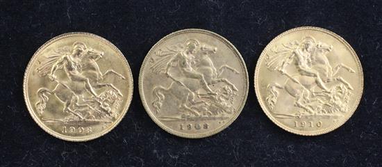 Three Edward VII gold half sovereigns, two 1908, VF and EF and 1910, EF