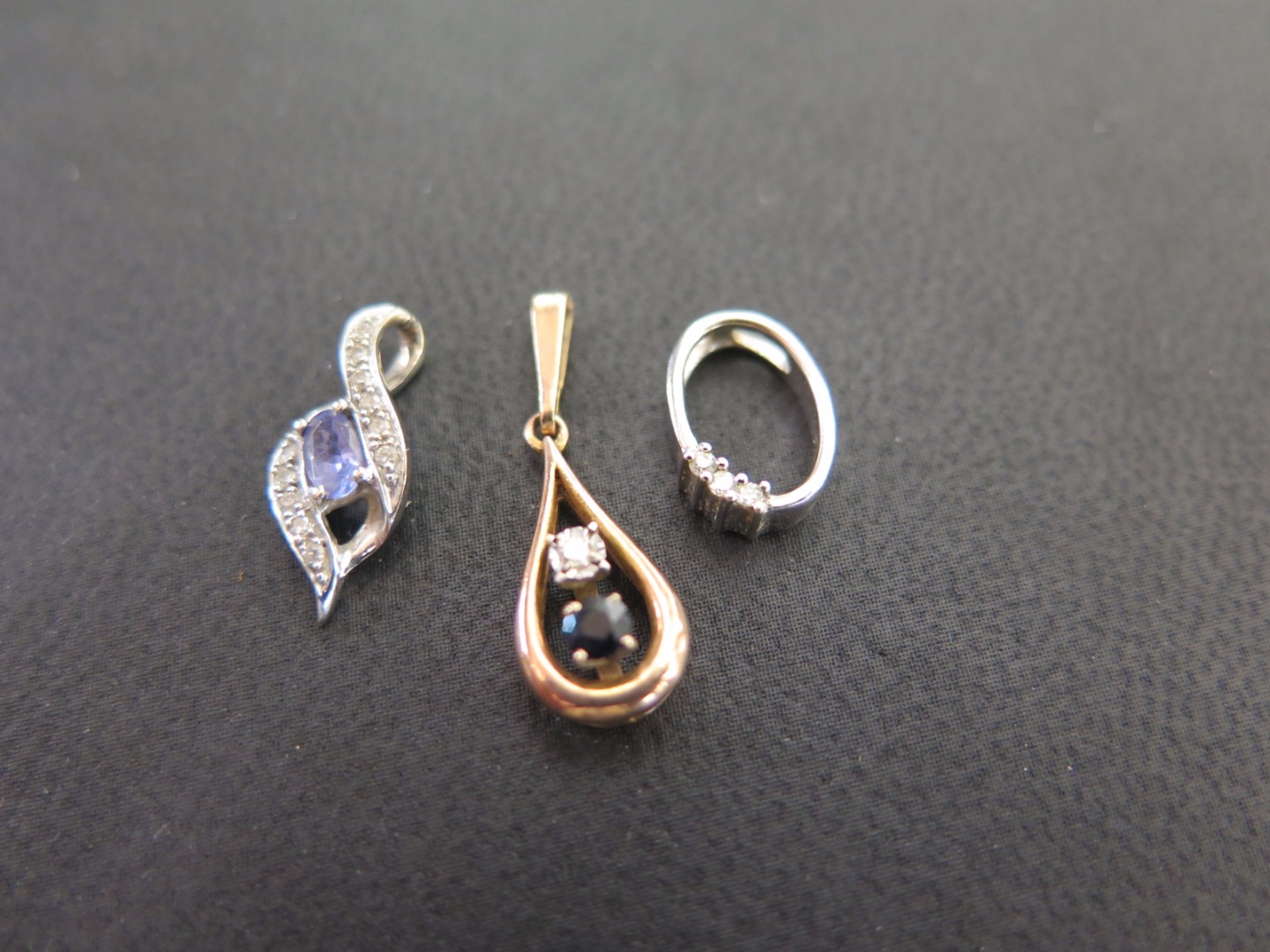 Three gem-pendants - To include diamond, sapphire and tanzanite - With marks indicating 9ct gold