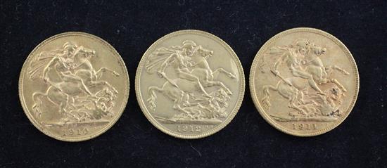 Three George V gold sovereigns, 1910, 1911 and 1912, Good VF to near EF