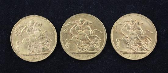 Three George V gold sovereigns, 1911, 1912 and 1915, Good VF to near EF