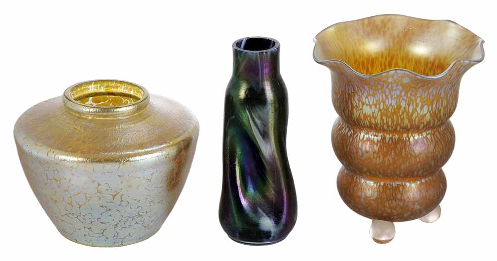Continental, early 20th century, shoulder vase with gold [candia papillon is unmarked, possibly Loetz, Austria, vase with ruffled rim and three ball feet is etched on bottom "CZECHO/SLOVAKIA" in an oval, others are unmarked, 4-3/4 to 6-1/2 in.
