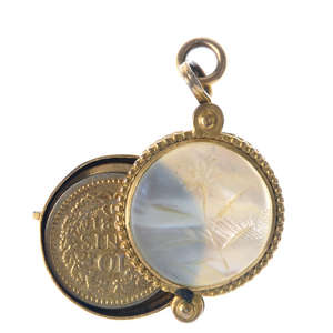 To include an oval-shape locket, with engraved garter detail and foliate embossed surround, an oval-shape woven hair mourning brooch and a mother-of-pearl circular-shape case pendant, containing three coins. Lengths 1.5 to 3.7cms