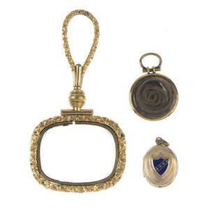 The first a magnifying glass, the rectangular glass with a floral frame and open pear-shape handle, together with a gold front and back locket with enamel shield to one side and a circular glazed panel pendant, containing a lock of hair. Leng