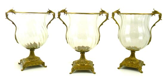 bulbous bodies with flared rims, textured brass trim along rims with applied scroll form handles, reeded standard with foliate motif atop square bases with four scroll feet unmarked, each with expected surface wear including scratching, each approxim