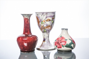 including a small squat vase with pink floral decoration on a cream ground, impressed factory marks to base with an apple symbol, handpainted 'J6' and signed with initials 'KB', a shouldered oviform vase with long trumpet neck, red mottled with green