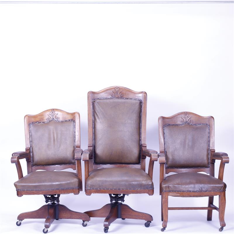 Three oak office chairs / armchairs with carved detail and leather upholstery