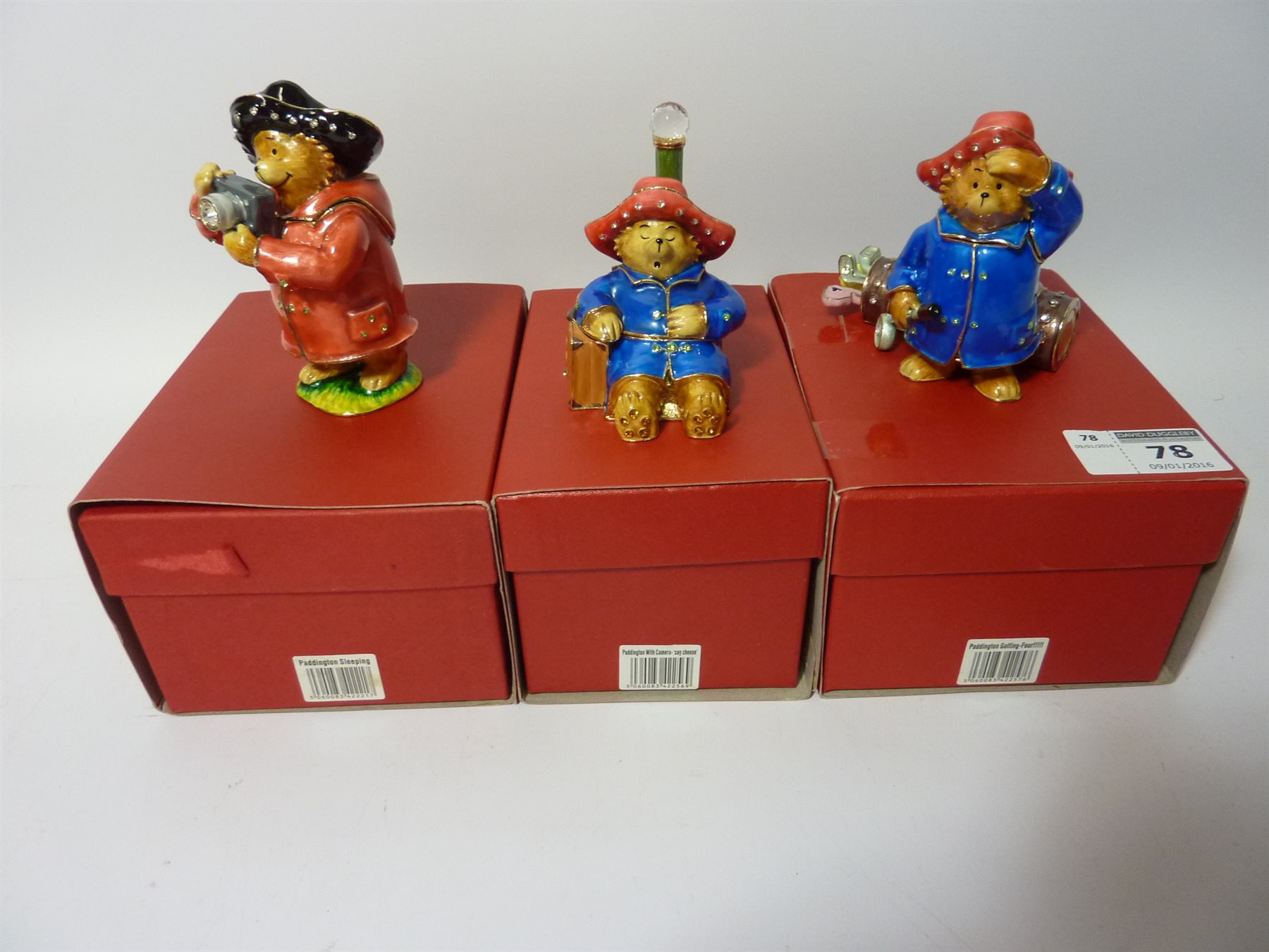 Three Paddington Bear Hidden Treasures trinket boxes - 'Paddington with Camera', 'Paddington Golfing' and 'Paddington Sleeping