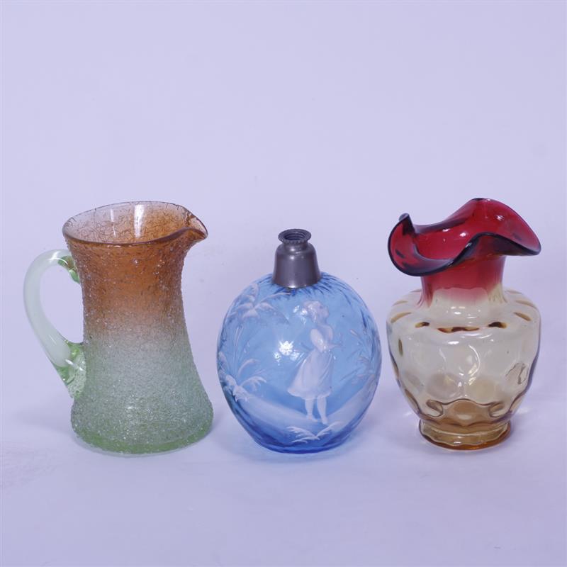 Three pc. Victorian Art Glass. Miniature Pitcher w/ crackle texture. Small yellow & red vase