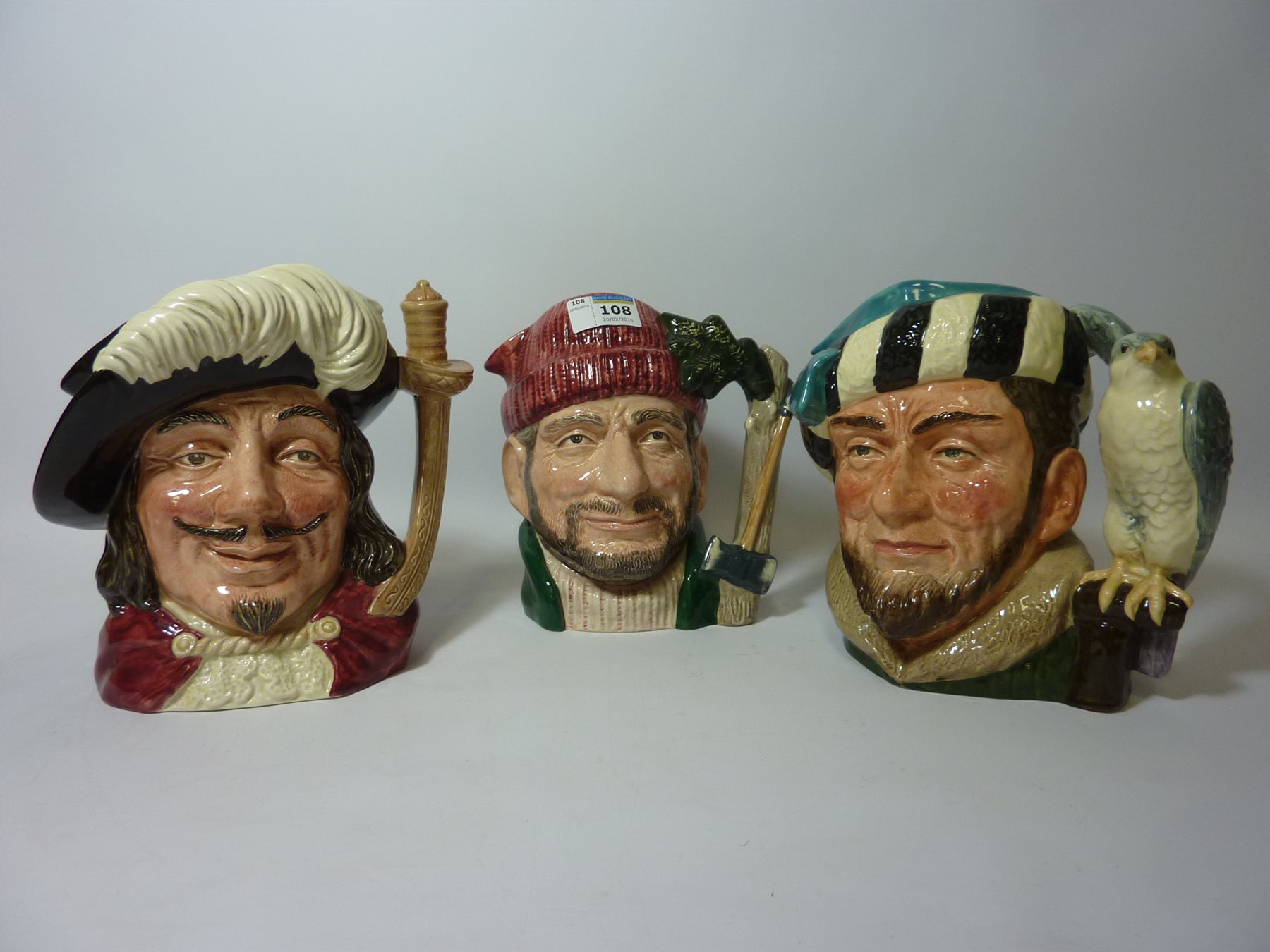 Three Royal Doulton character jugs - 'Lumberjack', 'Porthos', 'The Falconer' and 'Lumberjack' (3)