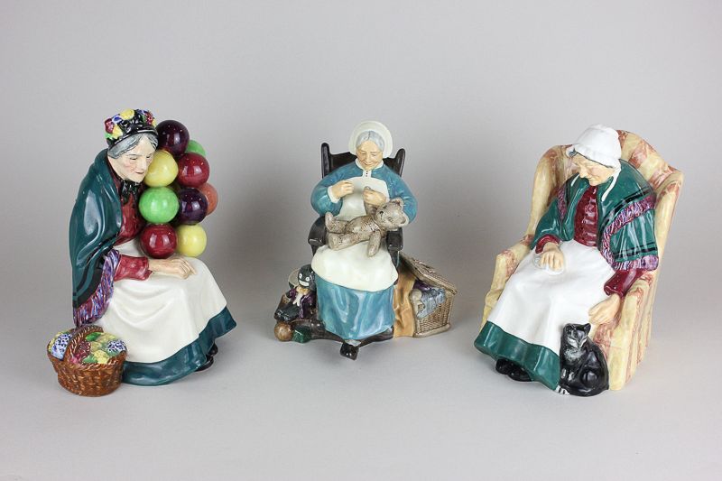 Three Royal Doulton porcelain figures including a pre 1959 The Old Balloon Seller (HN1315), Forty Winks (HN1974) and Nanny (HN2221)