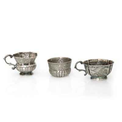Three Russian silver vodka cups, chased with eagles, rocailles and geometric patterns