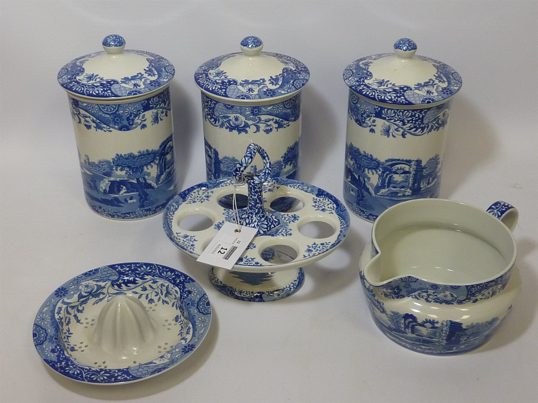 Three Spode Italian canisters, egg stand, lemon juicer and a squat jug