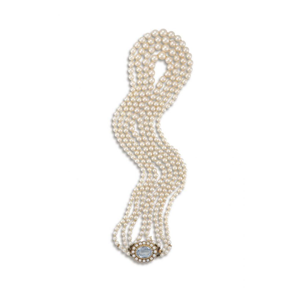 designed as three graduated strands of cultured pearls, approximately 3.3mm to 7.4mm, to a gold clasp set to the centre with an oval-cut aquamarine and half-pearls, approximate length of shortest strand 40mm