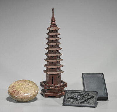 Three Chinese pieces, including: carved inkstone, with cover exhibiting blossoms in relief; round stone box, of mottled pink and grey coloration; together with soapstone pagoda, comprising nine tiers; Provenance: Collection of Yoshiko Faye Osako-Naka