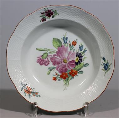 "Altosier" (nach einem Entwurf von Kändler für Meissen, 1730er Jahre). Bunte Blumenmalerei, Kratzer. Braun staffierter Rand. Unterglasurmarke Kaiserliche Porzellanmanufaktur St. Petersburg, Periode Katharina II., 1762-1796 sowie Zusatz in Purpur für